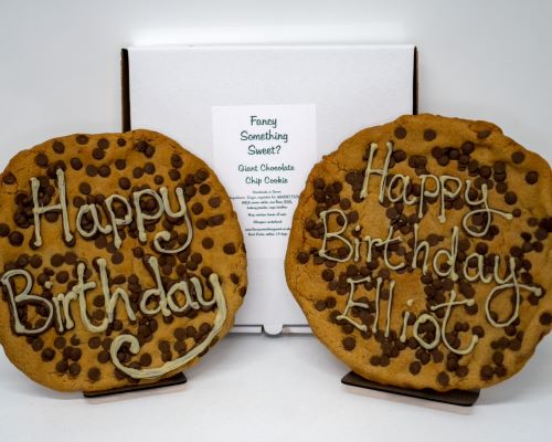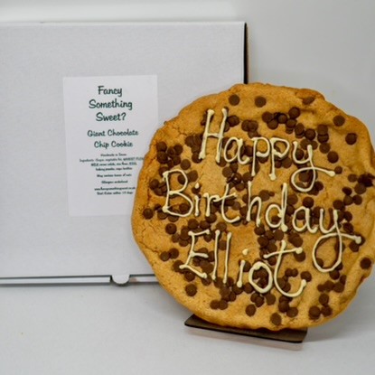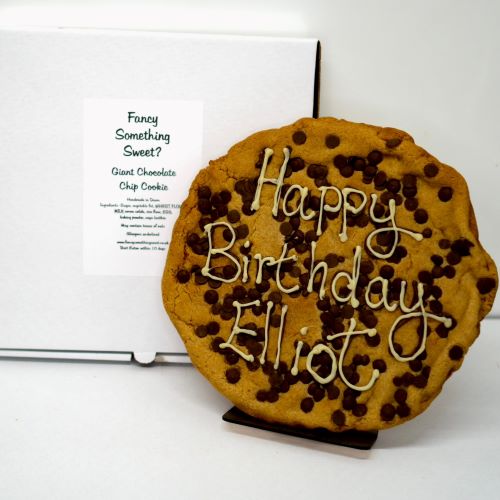My Cookies are made with the finest quality ingredients, I use local free range eggs, quality couverture chocolate chips and no packet mixes. These are my personalised cookies. 10 inches wide and weighing 500grams, personalised with your special msg,( please give your msg at checkout) Your cookie will be packed in a flat pizza style box on a bed of bubble wrap and tissue paper. A gift note is also available if you would like to send your cookie direct, please add your msg in the personalisation box.