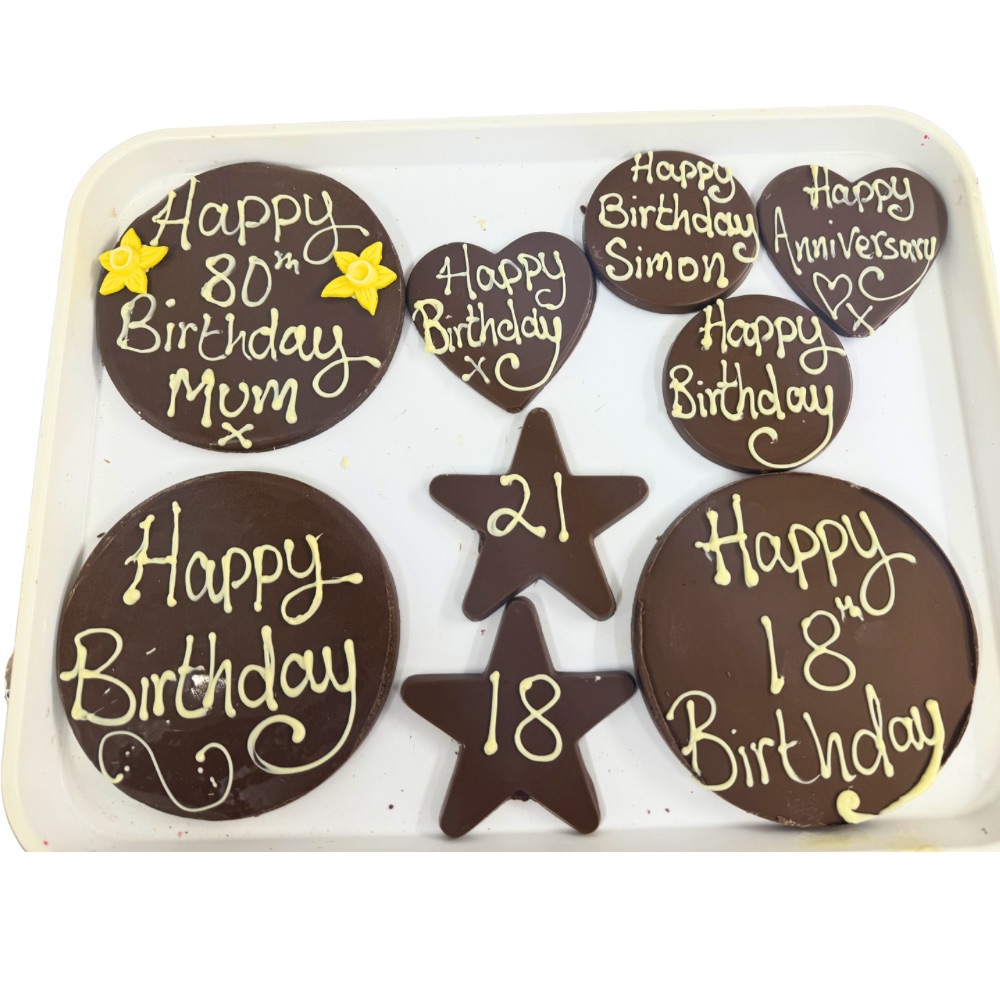 Personalise your own cake topper! Made from our delicious chocolate and hand piped. Small or Large in round, heart, or star, (star only in small). This item can be used as a cake topper, place setting or gift!