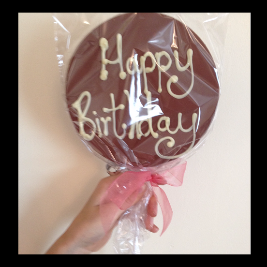 Giant 8 inch Chocolate Lolly on a wooden wrapped in a cellophane bag and tied with a ribbon. Personalised just for you with a name or a message! Please order your lollies 3 days before dispatch as they are all hand made to order. This is the Giant lolly weighing 350g of chocolate!