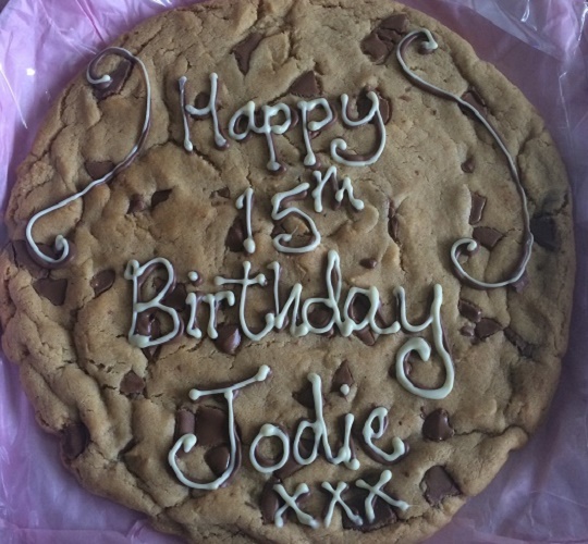My Cookies are made with the finest quality ingredients, I use local free range eggs, quality chocolate chips and no packet mixes. These are my personalised cookies. 12 inches wide and weighing 600g, they are made to order so will be fresh when they are sent. They personalised with your special msg,( please give your msg at checkout) Your cookie will be packed in a flat pizza style box on a bed of bubble wrap and tissue paper. A gift note is also available if you would like to send your cookie direct, please add your msg in the personalisation box.